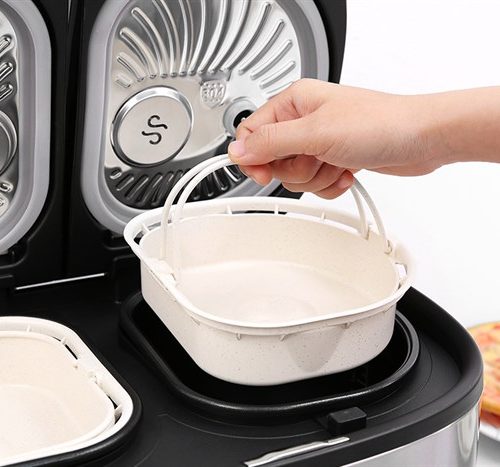 Người dùng có thể vừa nấu cơm, hấp rau, hấp trứng, hầm thịt nhờ có 2 nồi con và 2 xửng hấp kèm giúp tiết kiệm tối đa thời gian nấu nướng.