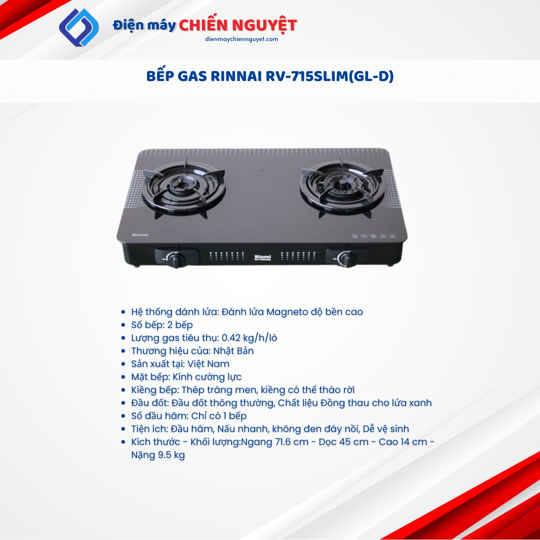 – Bếp gas Rinnai RV-715Slim(GL-D) với thiết kế đạt tiêu chuẩn an toàn tiện dụng quốc tế, bên cạnh đó với khả năng hoạt động bền bi và cực kỳ tiết kiệm gas của mình chắc chắn sẽ là trợ thủ đắc lực, là người bạn đồng hành không thể thiếu của người nội trợ trong gia đình.