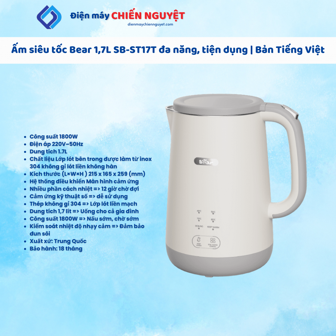Với thiết kế tinh tế và hiện đại, ấm đun nước giữ nhiệt Bear đã thu hút được sự quan tâm của cộng đồng người tiêu dùng. Ấm đun nước siêu tốc Bear luôn nằm trong top thiết bị đồ gia dụng được nhiều gia đình Việt ưa chuộng nhất. Hãy cùng tìm hiểu nhưng ưu điểm nồi bật của Bear SB-ST17T sau đây: