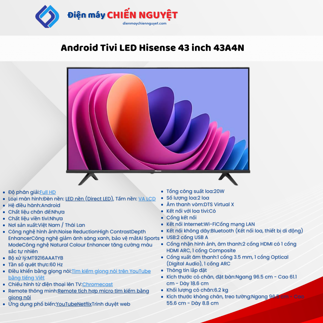 Android Tivi LED Hisense 43 inch 43A4N trang bị màn hình 43 inch kèm nhiều công nghệ hình ảnh tăng cường chất lượng hiển thị như Noise Reduction, Depth Enhancer, Natural Colour Enhancer, ngoài ra còn có công nghệ DTS Virtual X giúp bạn thưởng thức âm thanh vòm chân thực.