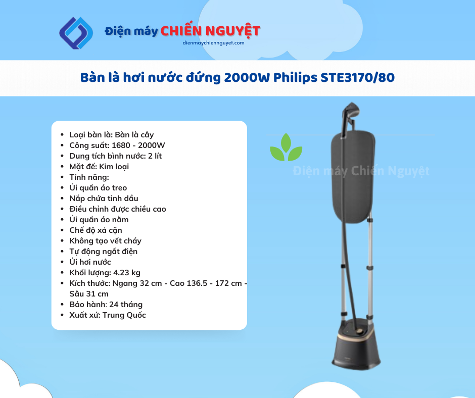 Bàn ủi hơi nước đứng Philips STE3170/80 với thiết kế gọn, màu sắc hiện đại với mặt đế kim loại ủi mượt mà hơn và dễ dàng vệ sinh, tính năng an toàn tự động ngắt điện, bình chứa nước 2 lít giúp ủi được nhiều quần áo hơn mà không phải đi châm nước nhiều lần, hy vọng với những tính năng ưu việt trên, chiếc bàn ủi Philips đến từ thương hiệu Hà Lan này sẽ là một lựa chọn đáng cân nhắc cho gia đình bạn