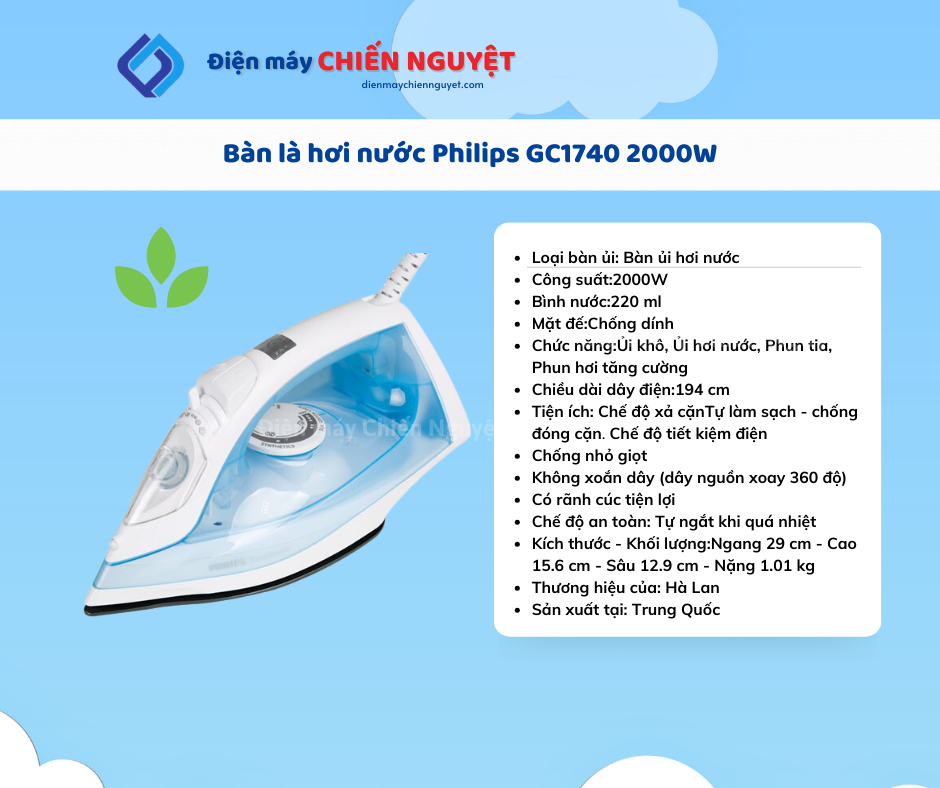 Bàn ủi hơi nước Philips GC1740 thiết kế hiện đại, ủi đồ mau thẳng, tiện dụng trong gia đình, cửa hàng giặt ủi, khách sạn,