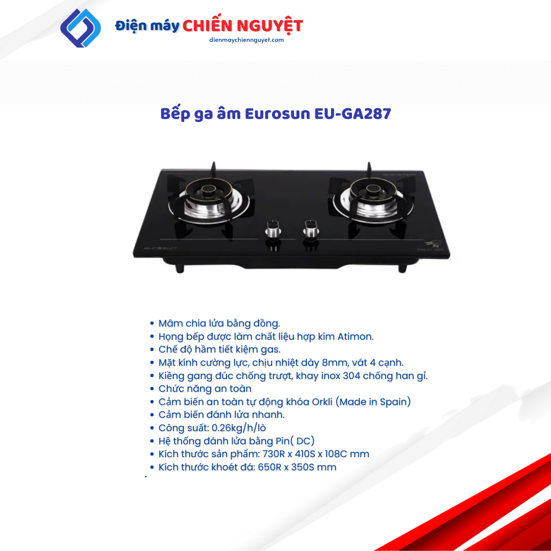 Bếp ga âm Eurosun EU-GA287 thiết kế 2 lò nấu và được sản xuất trên dây chuyền hiện đại với các linh kiện cao cấp đồng bộ cấu thành sản phẩm.