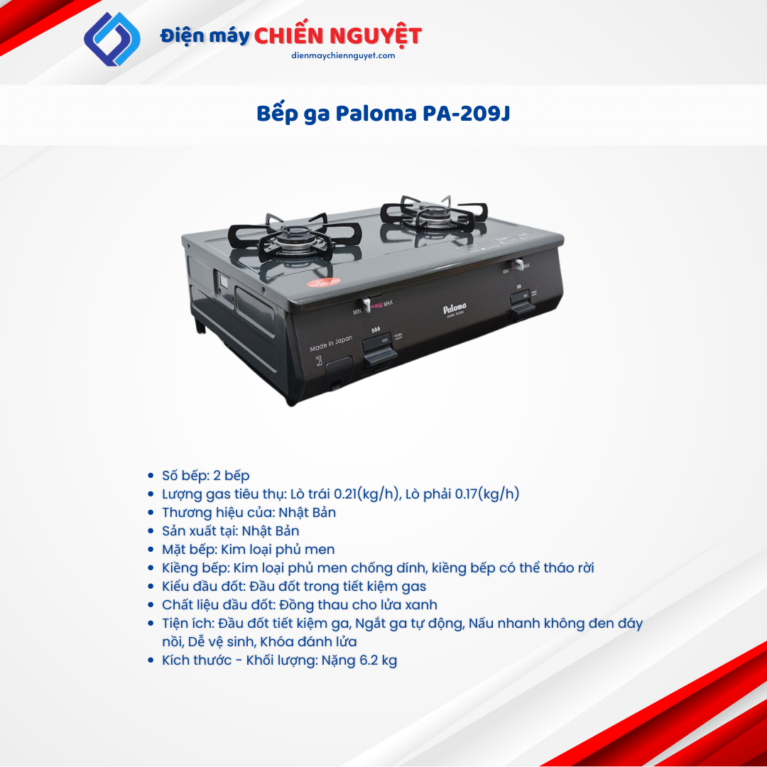 Bếp gas đôi Paloma PA-209J sản xuất tại Nhật Bản, hàng cao cấp, độ bền cao, đem đến cho gia đình bạn các món ăn ngon, hấp dẫn được chế biến nhanh chóng, dễ dàng và rất an toàn khi sử dụng.