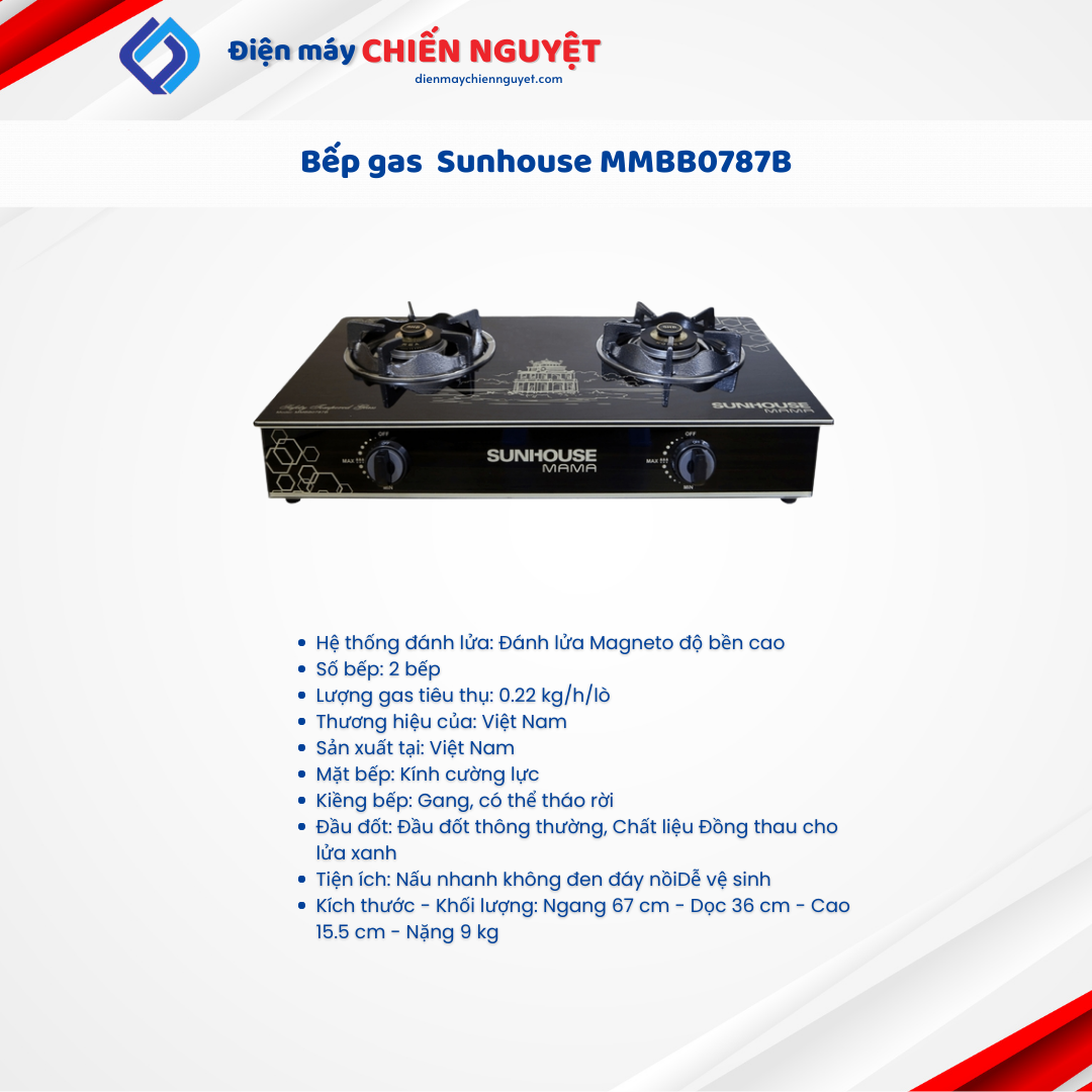 Bếp gas đôi dương kính Sunhouse Mama MMBB0787B chất lượng bền bỉ, tiết kiệm gas và an toàn cho người sử dụng. Bếp phù hợp với không gian bếp của mọi gia đình Việt, là sự lựa chọn đúng đắn dành cho người tiêu dùng.