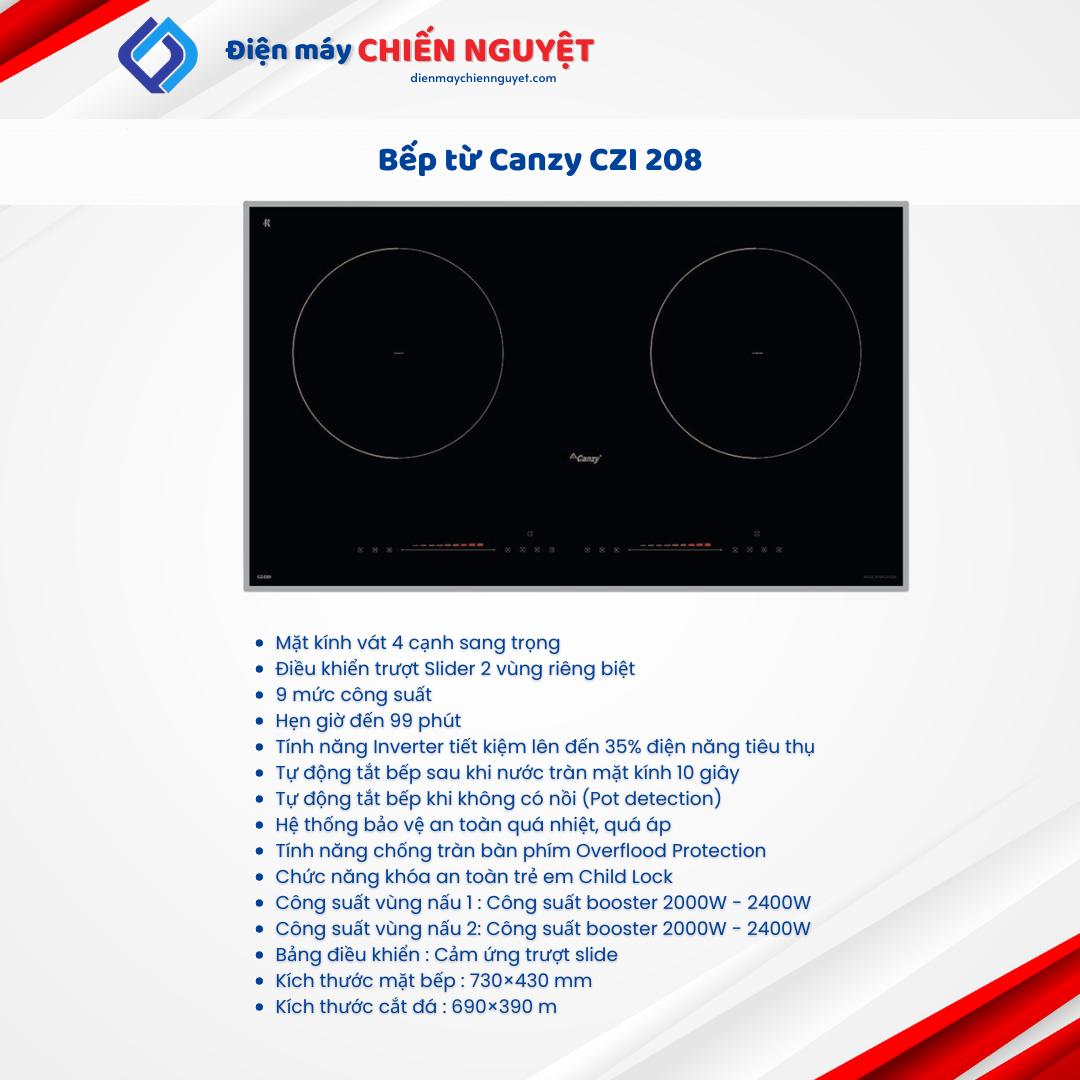 - Bếp từ Canzy CZI 208 là sự lựa chọn hoàn hảo dành cho bạn! Với thiết kế sang trọng, công nghệ tiên tiến và tính năng đa dạng và mức giá vô cùng bình dân, bếp từ Canzy CZI 208 tạo ra một trải nghiệm nấu nướng tuyệt vời và nâng cao sự hiệu quả trong việc chuẩn bị các món ăn.