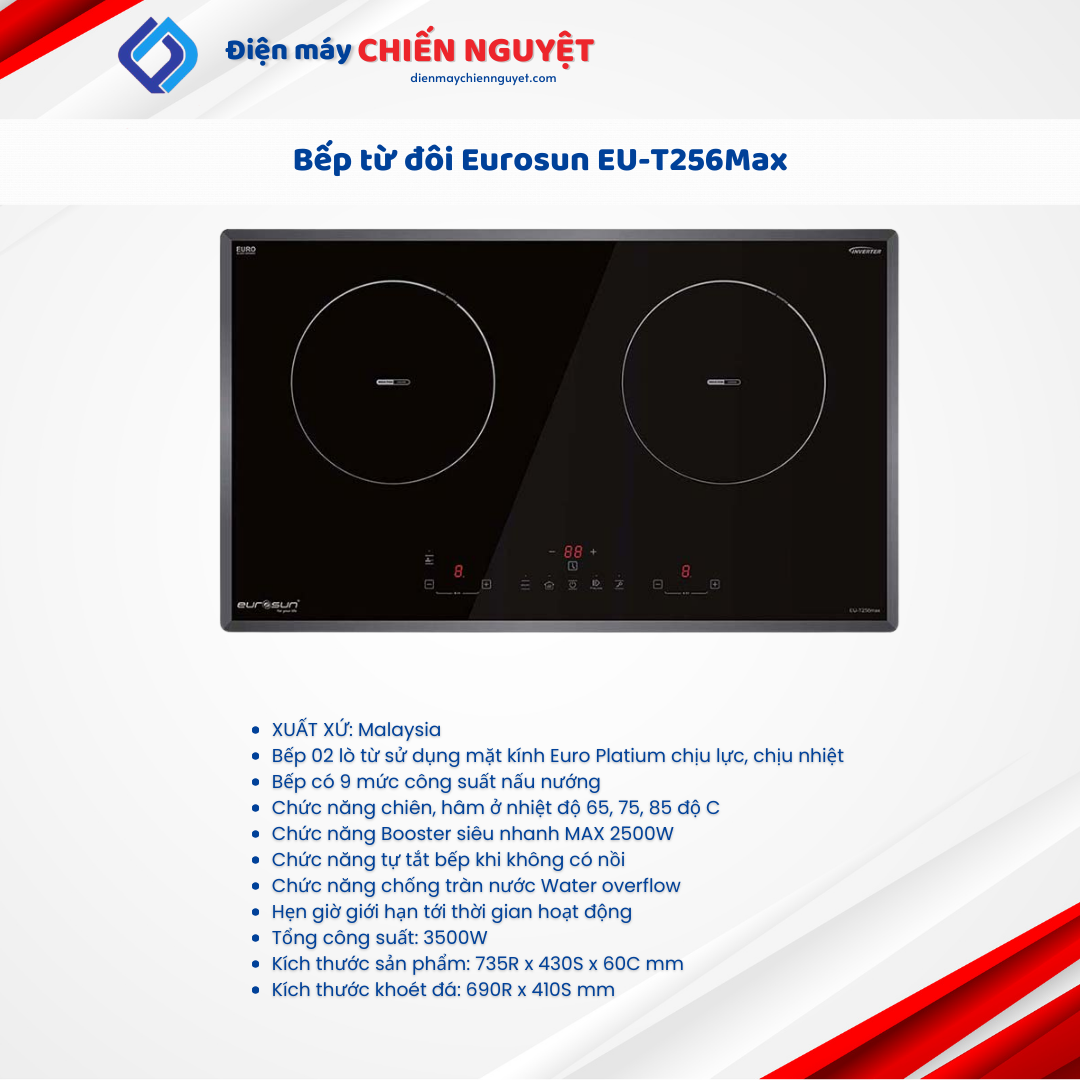 Bếp từ Eurosun EU-T256Max được nhập khẩu nguyên chiếc về thị trường Việt Nam đang được người dùng ưa chuộng với thiết kế bắt mắt, sang trọng và hiện đại đặc biệt sản phẩm sở hữu nhiều chức năng mới hỗ trợ người dùng trong quá trình nấu ăn.