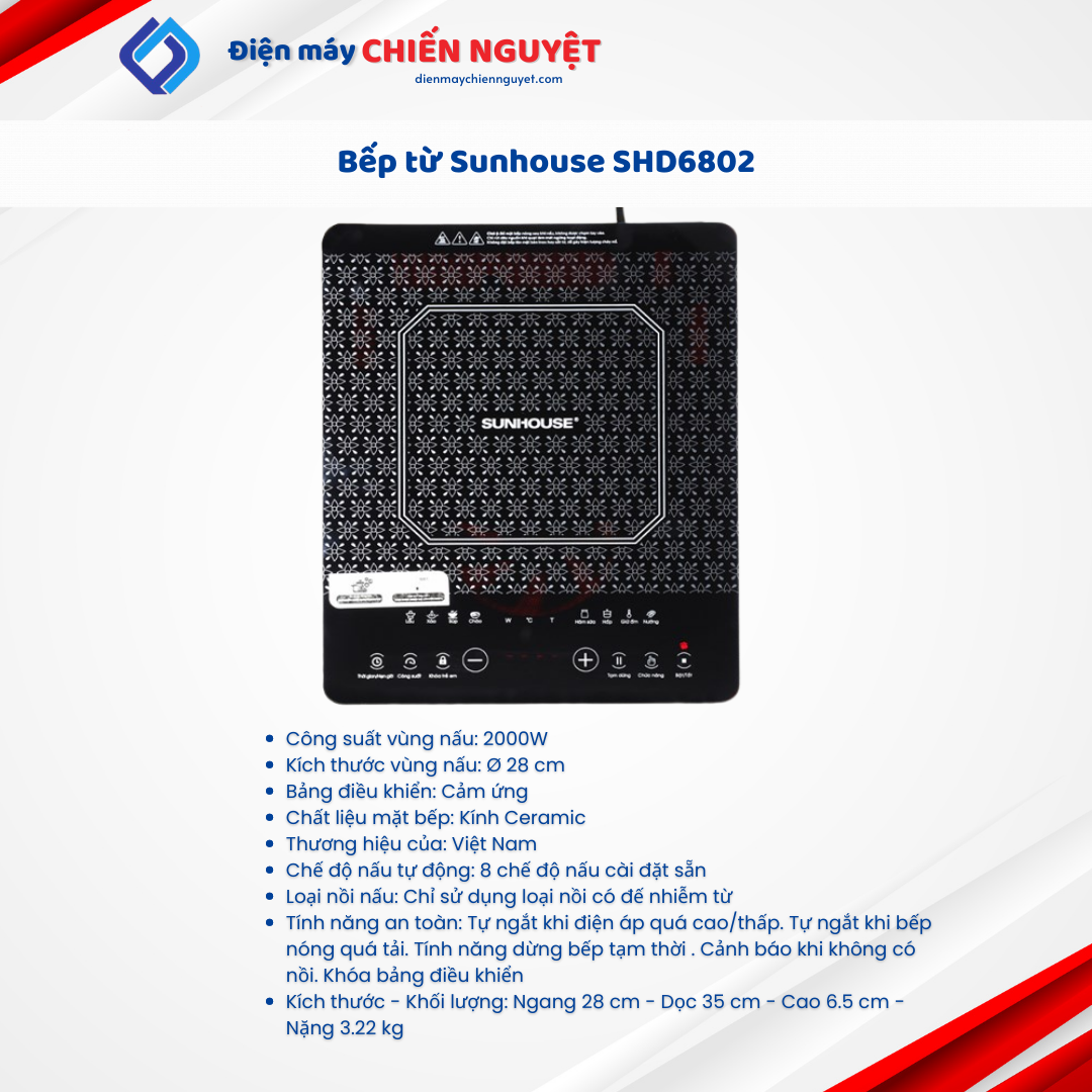 Bếp từ Sunhouse SHD6802 vùng nấu lớn, dễ dàng nắm bắt thông tin về điện năng tiêu thụ, hoạt động an toàn, hỗ trợ nấu ăn nhanh, tiện lợi, thiết kế nhỏ gọn dễ dàng sử dụng cho nhiều nhu cầu.
