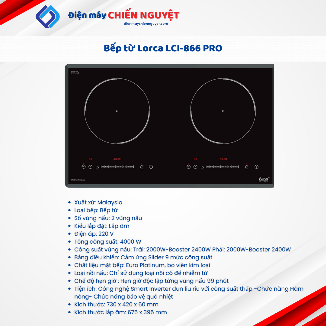 Bếp từ đôi LCI 866 Pro có xuất xứ Malaysia được thiết kế gồm 2 vùng nấu riêng biệt với tổng mức công suất 4800W và nhiều tính năng công nghệ vượt trội. Bếp có giá thành khá phù hợp nên được các gia đình ưa chuộng.
