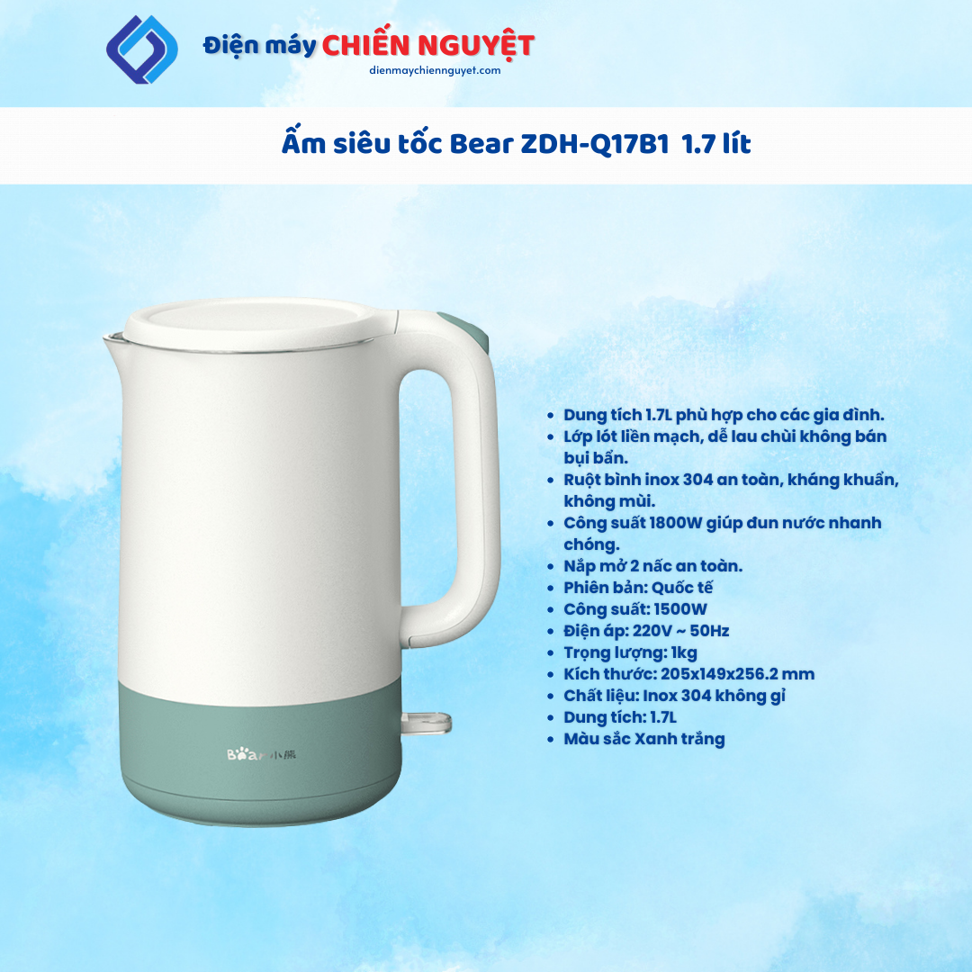Ấm đun nước siêu tốc Bear Q17B1 sở hữu một số đặc điểm nổi bật sau đây: