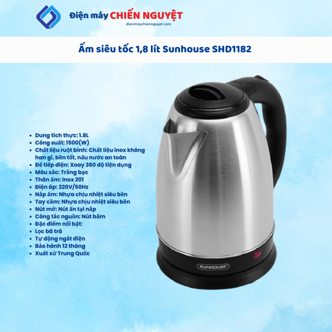 Bình siêu tốc Sunhouse 1.8 lít SHD1182 thiết kế gọn nhẹ, tiện di chuyển, công suất lớn, là vật dụng không thể thiếu cho gian bếp mọi nhà.