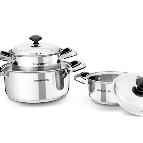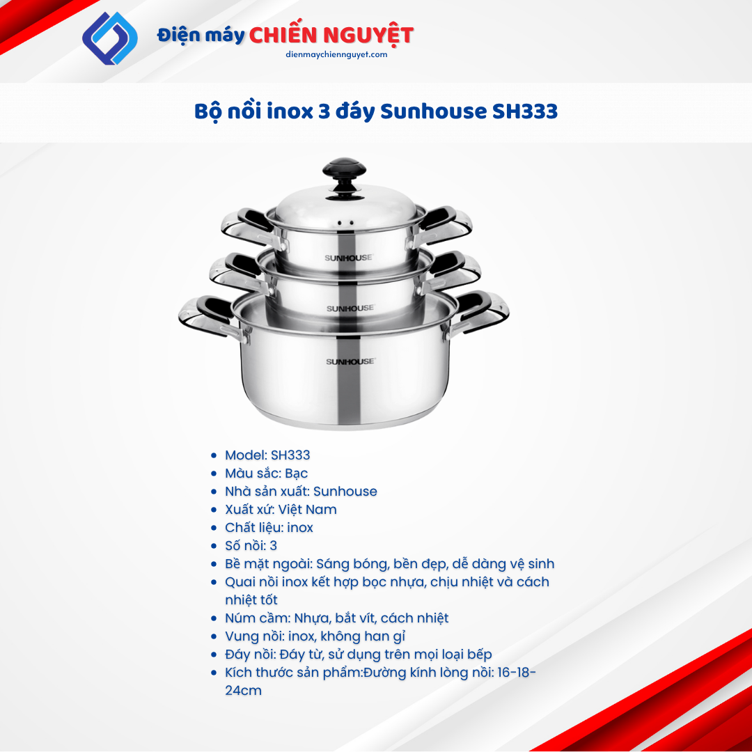Bộ nồi inox 3 đáy SUNHOUSE SH333 với chất liệu inox sáng bóng, an toàn, vung inox dễ vệ sinh, quai núm inox kết hợp nhựa an toàn, sản phẩm còn có 3 lớp đáy dày, giúp nhiệt lượng tỏa đều, món ăn chín ngon hơn giúp bạn sử dụng linh hoạt để chế biến những món ăn thơm ngon và bổ dưỡng cho gia đình.