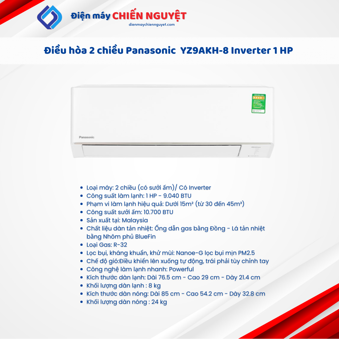 Điều hòa 2 chiều Panasonic Inverter YZ9AKH-8 inverter 1HP giúp thanh lọc không khí, làm ấm, làm mát mạnh mẽ, tiết kiệm năng lượng tiêu thụ, dễ điều khiển bằng điện thoại qua Wifi, dễ dàng phát hiện lỗi phát sinh trong quá trình máy vận hành, lựa chọn dành cho gia đình có phòng dưới 15m².