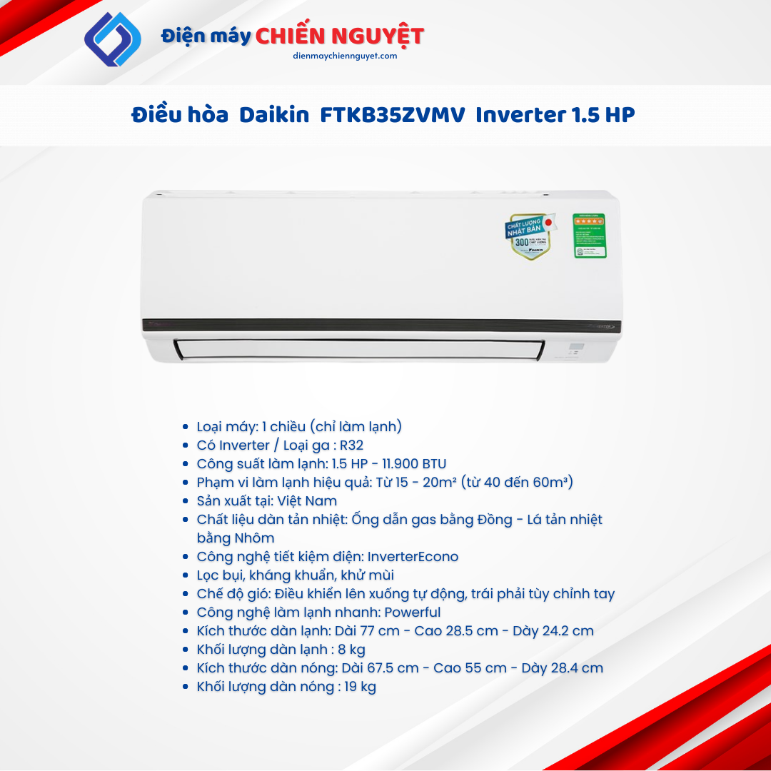 Giới thiệu điều hòa Daikin FTKB35ZVMV Inverter 1.5HP – Hiện đại, tiết kiệm, bền bỉ