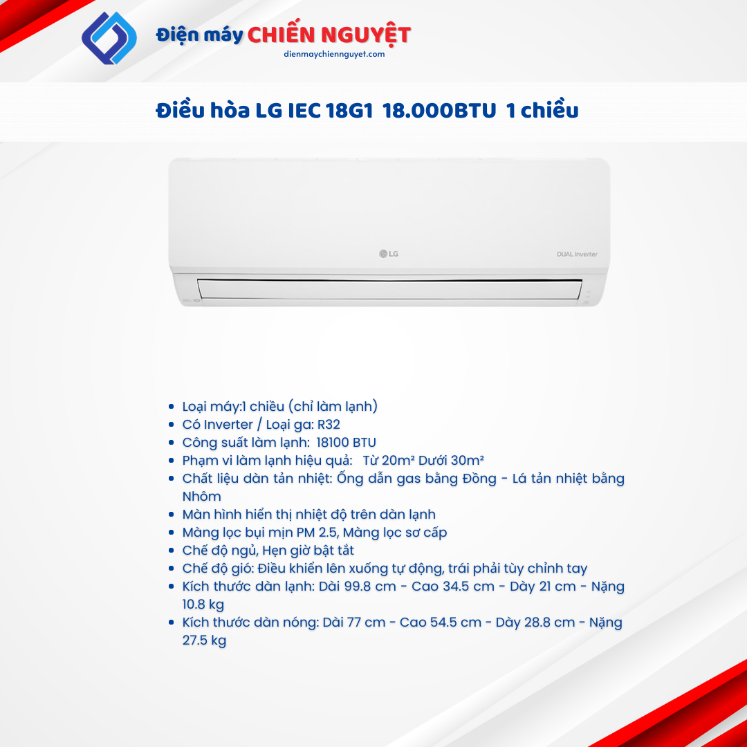 Điều hòa LG DUALCOOL™ Inverter 1 chiều 18.000 BTU (2.0HP) – IEC18G1 là lựa chọn hoàn hảo cho những không gian rộng rãi, mang đến không gian sống mát mẻ, trong lành và tiết kiệm điện năng.