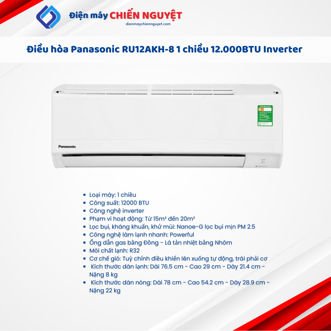 Điều hòa Panasonic RU12AKH-8 1 chiều 12.000BTU Inverter thiết kế tối giản, phù hợp cho nhiều không gian, làm mát trong tích tắc với công nghệ làm lạnh nhanh Powerful, giữ không gian sống trong lành, sạch sẽ hơn với công nghệ Nanoe-G lọc được bụi mịn PM 2.5, giảm hao phí điện năng nhờ công nghệ Inverter, chế độ ECO tích hợp A.I.