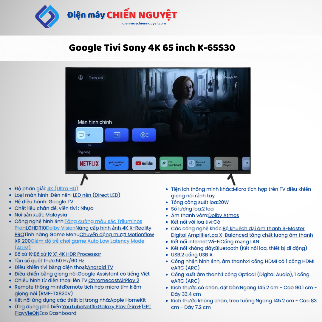 Google Tivi Sony 4K 65 inch K-65S30 với thiết kế siêu mỏng, màn hình 65 inch cùng độ phân giải 4K sắc nét, trang bị bộ xử lý 4K HDR Processor X1 mạnh mẽ, hỗ trợ các công nghệ hình ảnh ấn tượng như Dolby Vision, Triluminos Pro. Công nghệ âm thanh vòm Dolby Atmos, S-Master Digital Amplifier cho âm thanh mạnh mẽ, sống động. Điều khiển tivi bằng giọng nói có hỗ trợ tiếng Việt cùng hệ điều hành Google TV với kho ứng dụng phong phú sẽ là lựa chọn tuyệt vời, đáp ứng mọi nhu cầu giải trí cho gia đình.