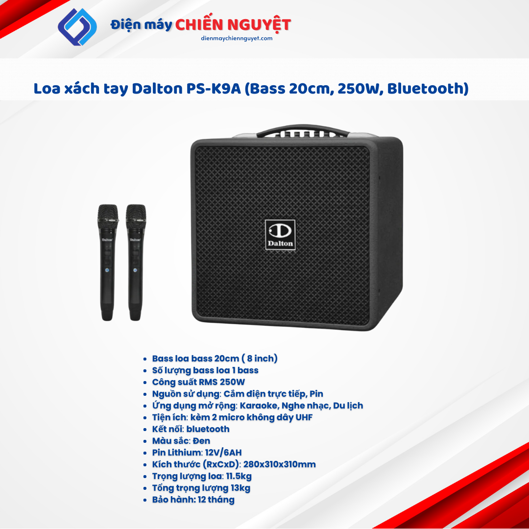 Loa xách tay Dalton PS-K9A là mẫu loa kéo di động mới nhất của Dalton, được ra mắt với sứ mệnh tiếp tục đem đến trải nghiệm giải trí tiện lợi cho người dùng. Kích thước nhỏ gọn, công suất 250W cùng loa bass 20cm và 2 micro không dây chất lượng cao đi kèm cho âm thanh ấn tượng, đáp ứng nhu cầu hát karaoke, nghe nhạc, du lịch, dã ngoại, bữa tiệc ngoài trời