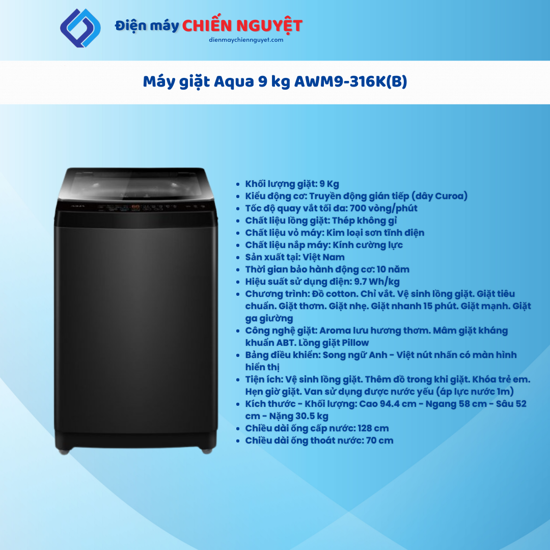 – Máy giặt Aqua 9 kg AWM9-316K(B) thuộc kiểu máy giặt lồng đứng – nắp trên được thiết kế tinh giản với tone màu đen chủ đạo hợp thời và tinh tế.