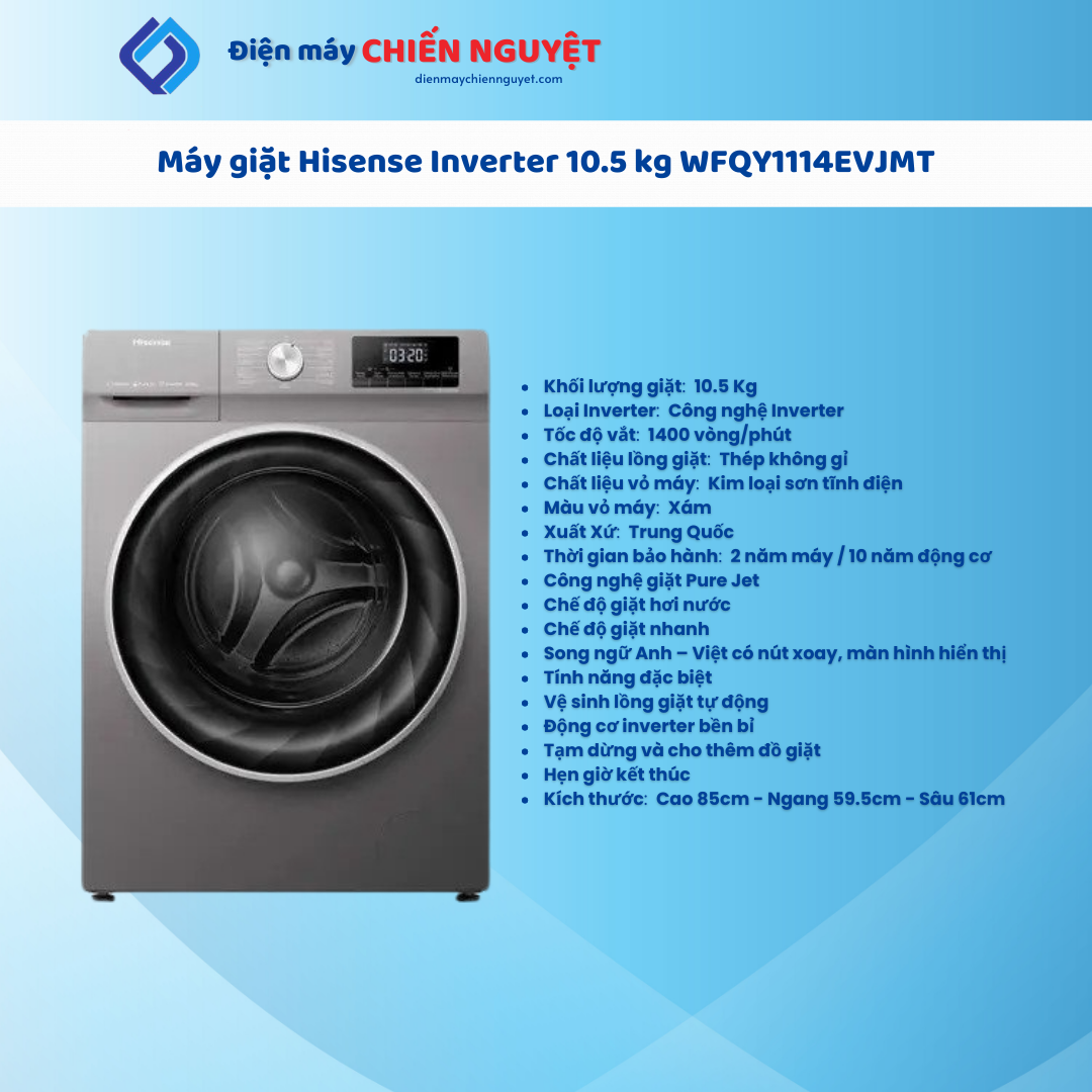 Máy giặt Hisense 10.5 kg WFQY1114EVJMT cửa trước lồng ngang trang bị công nghệ Pure Jet giặt sạch áo quần hiệu quả, chế độ giặt hơi nước diệt đến 99.9% vi khuẩn, động cơ inverter bền bỉ.