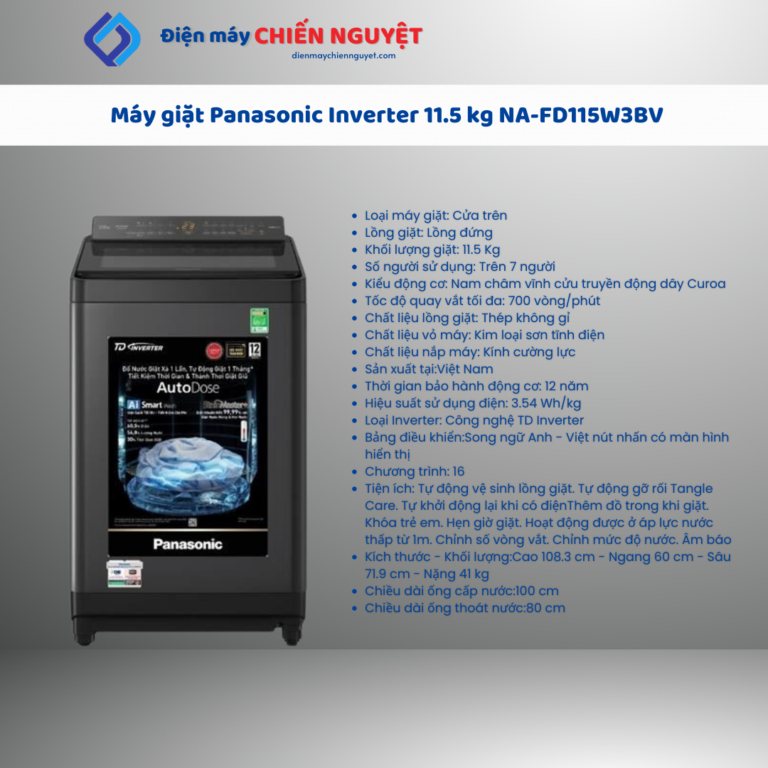 Máy Giặt Panasonic Inverter 11.5 Kg NA-FD115W3BV đơn giản hóa quy trình giặt giũ bằng cách tự động phân bổ nước giặt xả, lựa chọn chế độ giặt phù hợp. Các công nghệ giặt bao gồm giặt diệt khuẩn 99,99%, giặt lưu hương, thơm lâu hơn, tự động vệ sinh lồng giặt, các cảm biến AI thông minh tối ưu chương trình giặt, nâng cao khả năng chăm sóc vải nhưng vẫn đảm bảo quần áo sạch sẽ, tươm tất.