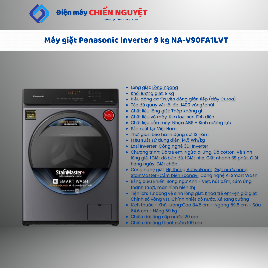 Máy giặt Panasonic Inverter 9 kg NA-V90FA1LVT có thiết kế sang trọng, đứng độc lập ở mọi không gian nội thất. Máy tích hợp 9 chương trình giặt cho bạn tùy chọn chương trình giặt phù hợp kết hợp cùng nhiều công nghệ giặt hiện đại cho kết quả giặt tối ưu . Công nghệ 3D i Inverter tiết kiệm điện, nhiều tiện ích sử dụng tích hợp trên chiếc máy giặt này.