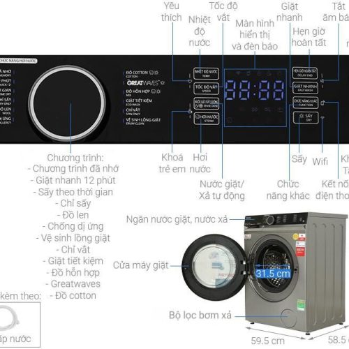 – Phun nước 360 độ: công nghệ cuốn trôi đi chất bẩn, chất giặt tẩy còn sót lại ở mặt trong cửa cho cửa máy sạch sẽ, đỡ tốn công vệ sinh.