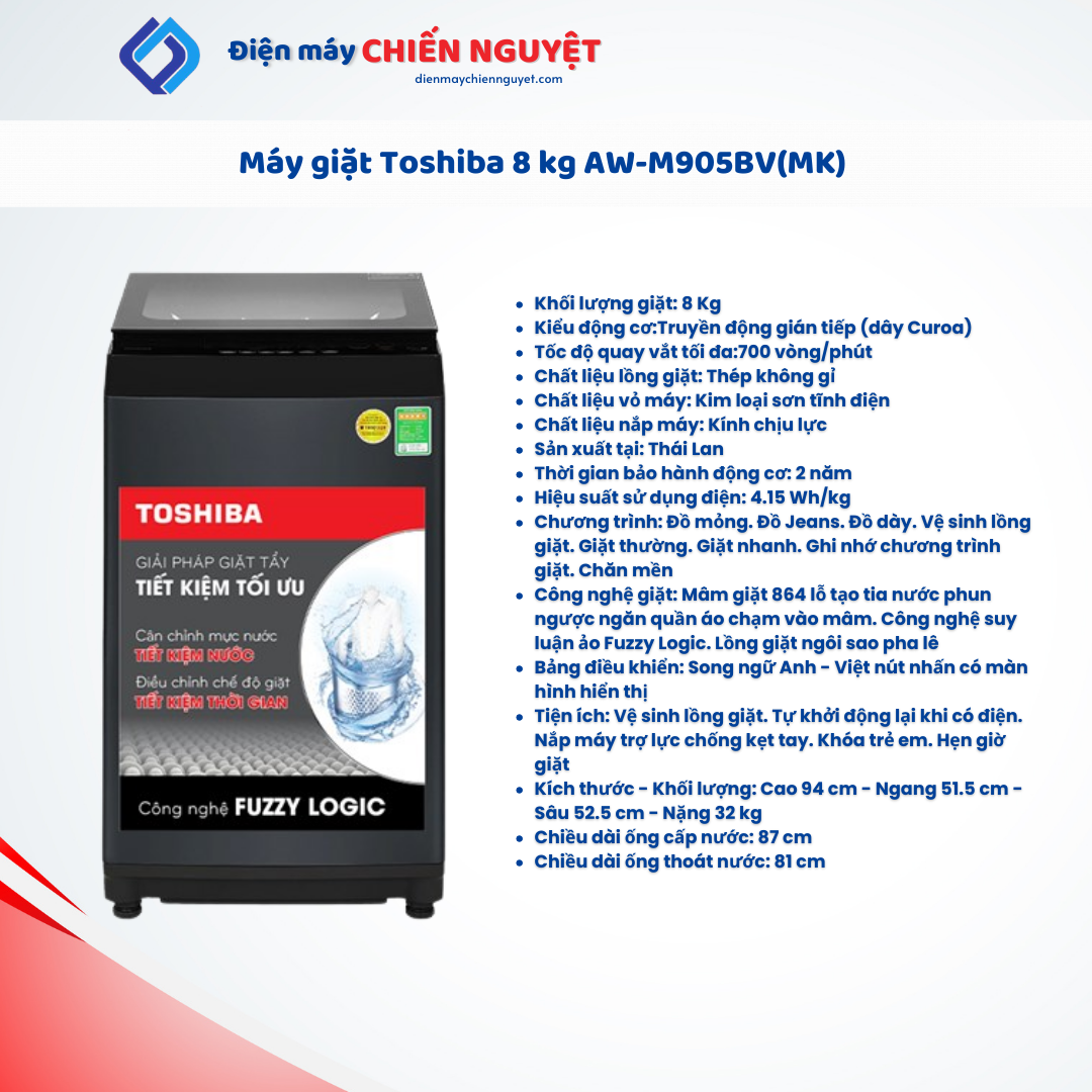 Máy giặt Toshiba 8kg AW-M905BV(MK) thuộc kiểu máy giặt cửa trên – lồng đứng sang trọng, giặt sạch quần áo và giảm thiểu hư tổn sợi vải với lồng giặt ngôi sao pha lê, tự động kiểm tra lượng đồ giặt và cân chỉnh mức nước nhờ công nghệ suy luận ảo Fuzzy Logic.