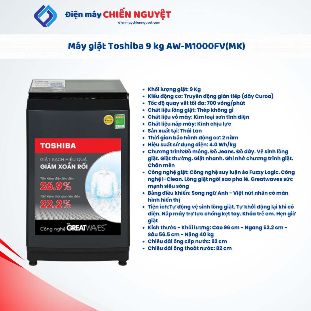Tóm lại, máy giặt Toshiba 9 kg AW-M1000FV(MK) phù hợp cho tất cả các gia đình có từ 3 – 5 thành viên hiện nay. Thiết bị này có khả năng giặt sạch hiệu quả mà tránh được việc làm phai màu và sờn sợi vải sau khi giặt, phù hợp cho những gia đình thường xuyên giặt các loại đồ mỏng nhẹ và đồ dày.