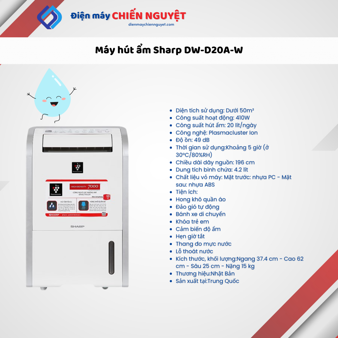 Máy hút ẩm Sharp DW-D20A-W hoạt động hiệu quả với công suất hút ẩm cao 20 lít/ngày phù hợp cho không gian dưới 50m2, độ ồn khi hoạt động chỉ 49 dB, bên cạnh đó máy còn trang bị nhiều tiện ích như hẹn giờ tắt, hong khô quần áo, đảo gió tự động,… xứng đáng là một sự lựa chọn đáng cân nhắc cho bạn và gia đình khi thời tiết vào nồm, ẩm ướt