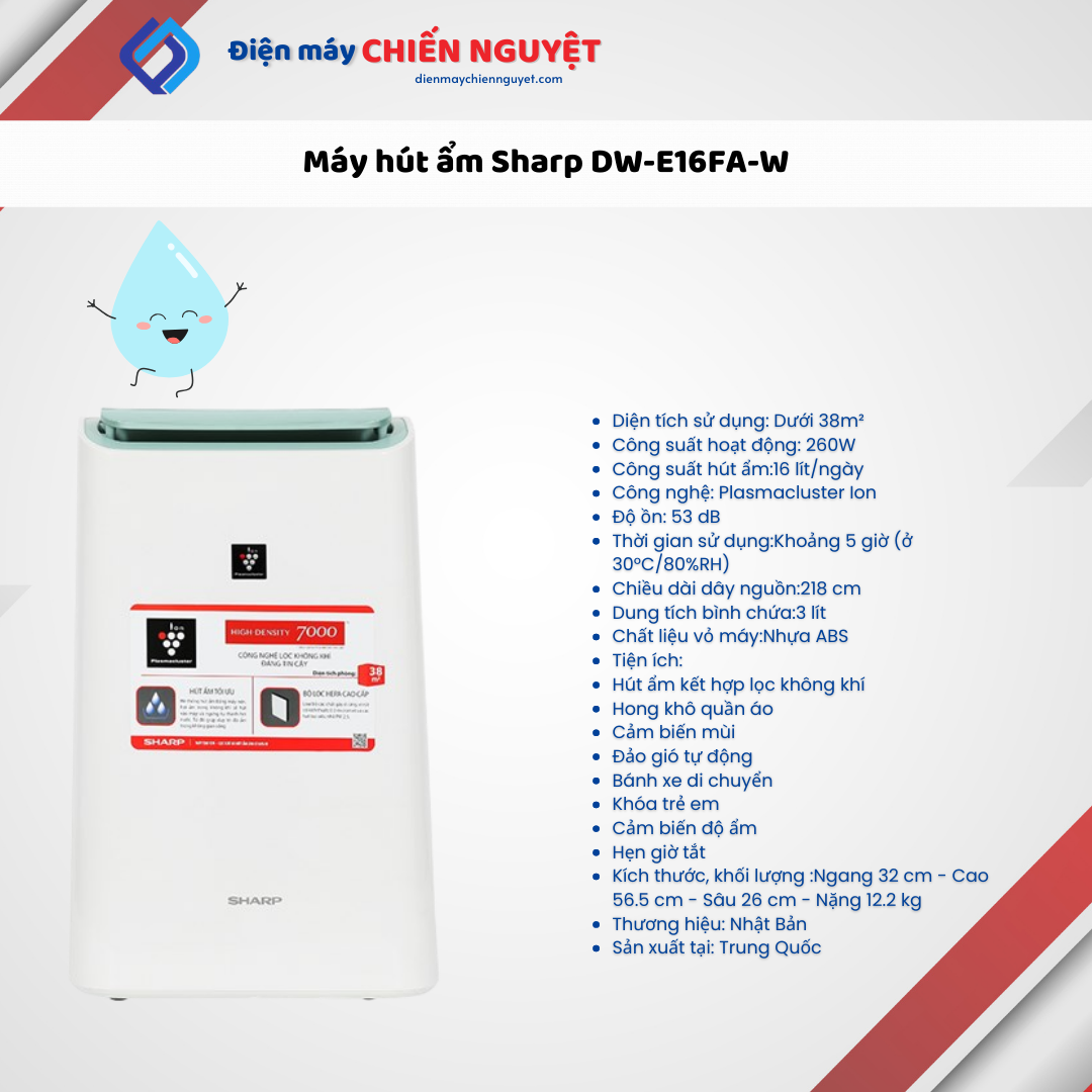 Có thể thấy máy hút ẩm Sharp DW-E16FA-W hoạt động hiệu quả với công suất hút ẩm cao 16 lít/ngày phù hợp cho không gian dưới 38m2 với nhiều tiện ích đi kèm: hẹn giờ tắt, cảm biến độ ẩm và mùi, lọc khí,… là lựa chọn đáng cân nhắc cho bạn và gia đình khi thời tiết vào nồm, ẩm ướt.