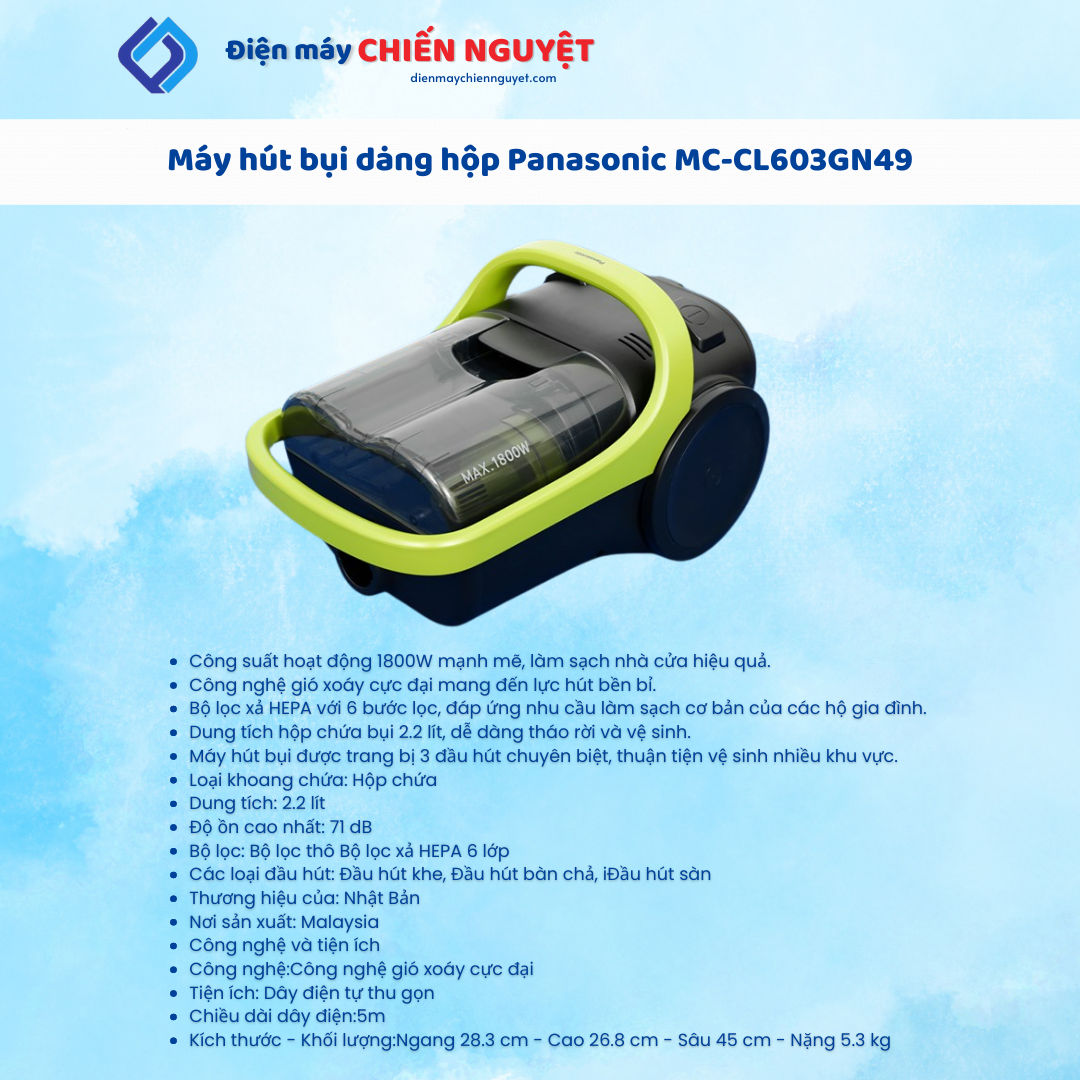 Máy hút bụi dạng hộp Panasonic MC-CL603GN49 với công suất 1800W, dung tích chứa bụi 2.2 lít được trang bị thêm 3 đầu hút khác nhau giúp thuận tiện trong việc vệ sinh nhà cửa, dây điện dài 5m có thể di chuyển đến nhiều vị trí trong nhà,… chắc chắn sẽ là một thiết bị gia dụng không thể thiếu trong mỗi gia đình