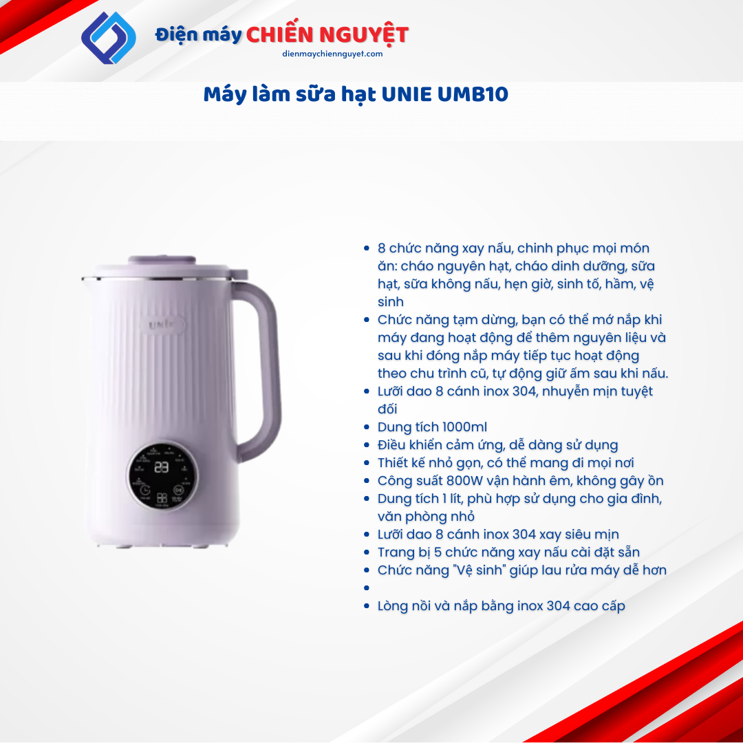 Máy làm sữa hạt Unie UMB10 tích hợp đến 8 chế độ chức năng, trong đó có 6 chế độ xay nấu tự động, giúp bạn tạo ra nhiều món ăn đa dạng thơm ngon, giàu dinh dưỡng. Dung tích lớn 1000ml đáp ứng tốt nhu cầu làm sữa hạt cho gia đình 2-4 người.