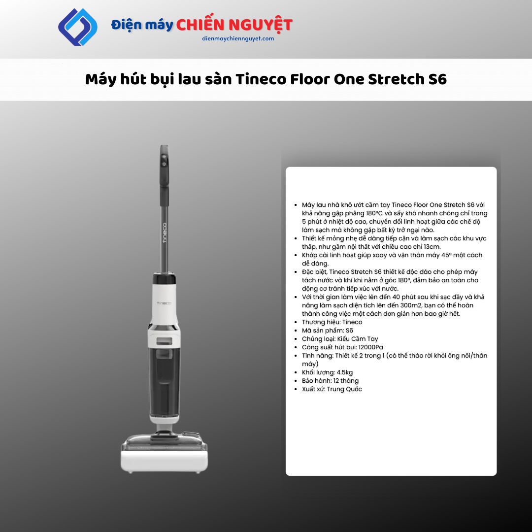 Máy lau nhà khô ướt cầm tay Tineco Floor One Stretch S6 Pro với lực hút mạnh mẽ 18.000Pa, thiết kế siêu mỏng chỉ 13cm, thiết bị này dễ dàng len lỏi vào mọi ngóc ngách. Hơn thế nữa, công nghệ DualBlock Anti-tangle chống rối thông minh kết hợp cùng con lăn tràn viền giúp sàn nhà sạch bóng không tì vết. Đặc biệt, tính năng sấy khô 85°C chỉ trong 5 phút giúp loại bỏ độ ẩm, ngăn ngừa vi khuẩn và nấm mốc. Cảm biến iLoop™ tối ưu hiệu suất làm sạch, còn pin mềm dạng túi bền bỉ mang lại trải nghiệm sử dụng lâu dài.