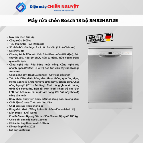 Máy rửa chén độc lập Bosch SMS2HAI12E thiết kế gọn đẹp, sức chứa lớn với chén bát cho 3 – 4 bữa ăn Việt, 6 chương trình rửa tùy chọn, rửa sạch và đảm bảo an toàn với công nghệ rửa nước nóng, tính năng Aquastop, hẹn giờ đến 24 tiếng, điều khiển bằng Home connect qua điện thoại và nhiều tính năng tiện dụng khác mà bạn chắc chắn nên chọn mua sản phẩm này để từ từ khám phá những lợi ích thiết thực mà máy đem lại.