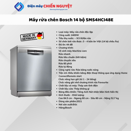 Máy rửa chén độc lập Bosch SMS4HCI48E có thiết kế sang trọng, có thể rửa được 3 – 4 bữa ăn Việt, cài đặt 6 chương trình rửa, các chương trình hỗ trợ tiện ích, nổi bật chương trình vệ sinh máy, an toàn với tính năng Aquastop chống rò rỉ, hẹn giờ đến 24 giờ, độ ồn tầm 44 dB, xứng đáng có mặt trong mọi ngôi nhà Việt.
