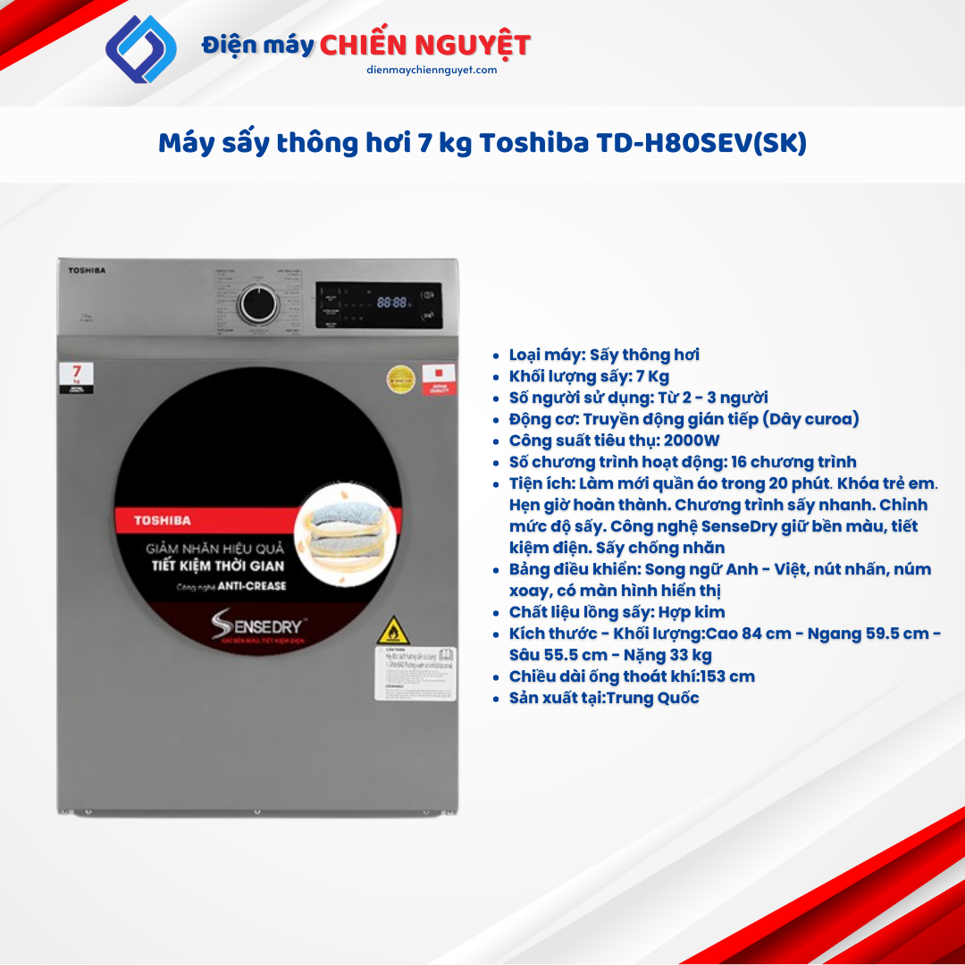 Đánh giá Máy sấy thông hơi 7 kg Toshiba TD-H80SEV(SK)