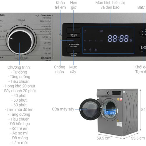 – Kiểu dáng: máy sấy có thiết kế lồng ngang – cửa trước tiện lợi, màu xám của máy dễ dàng kết hợp với nội thất trong nhà.