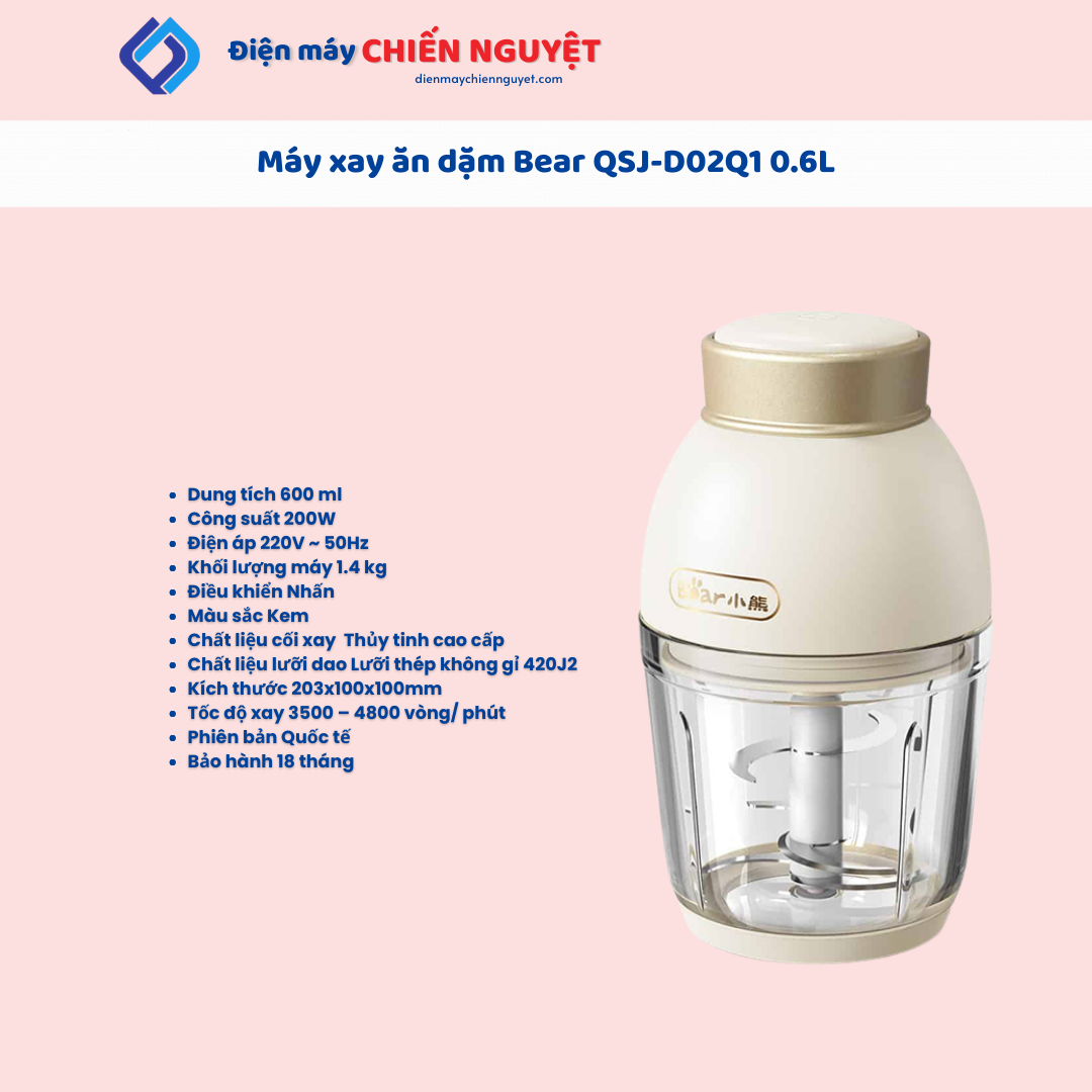 Máy xay ăn dặm Bear 0.6L QSJ-D02Q1 0.6L với thiết kế tinh tế, chất liệu an toàn và hiệu suất vượt trội, sản phẩm này sẽ là trợ thủ đắc lực không thể thiếu trong căn bếp của mọi gia đình.