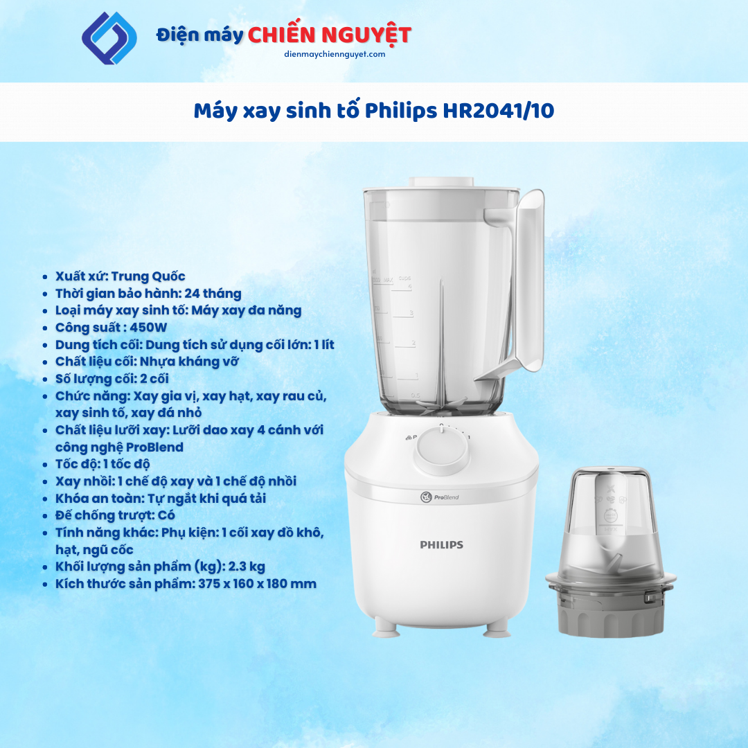 Máy xay sinh tố Philips HR2041/10 thiết kế độc đáo, hiện đại, màu sắc nhã nhặn, xay được nhiều loại thực phẩm khác nhau, đáp ứng nhu cầu cơ bản của cá nhân hoặc gia đình.