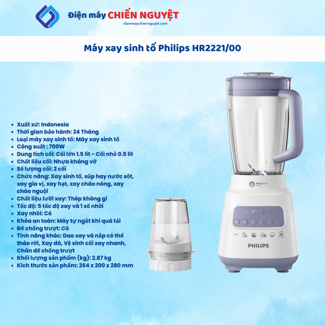 Máy xay sinh tố Philips HR2221/00 thương hiệu tốt, dùng đơn giản và tiện dụng, gia dụng hữu ích hỗ trợ chăm sóc dinh dưỡng gia đình.