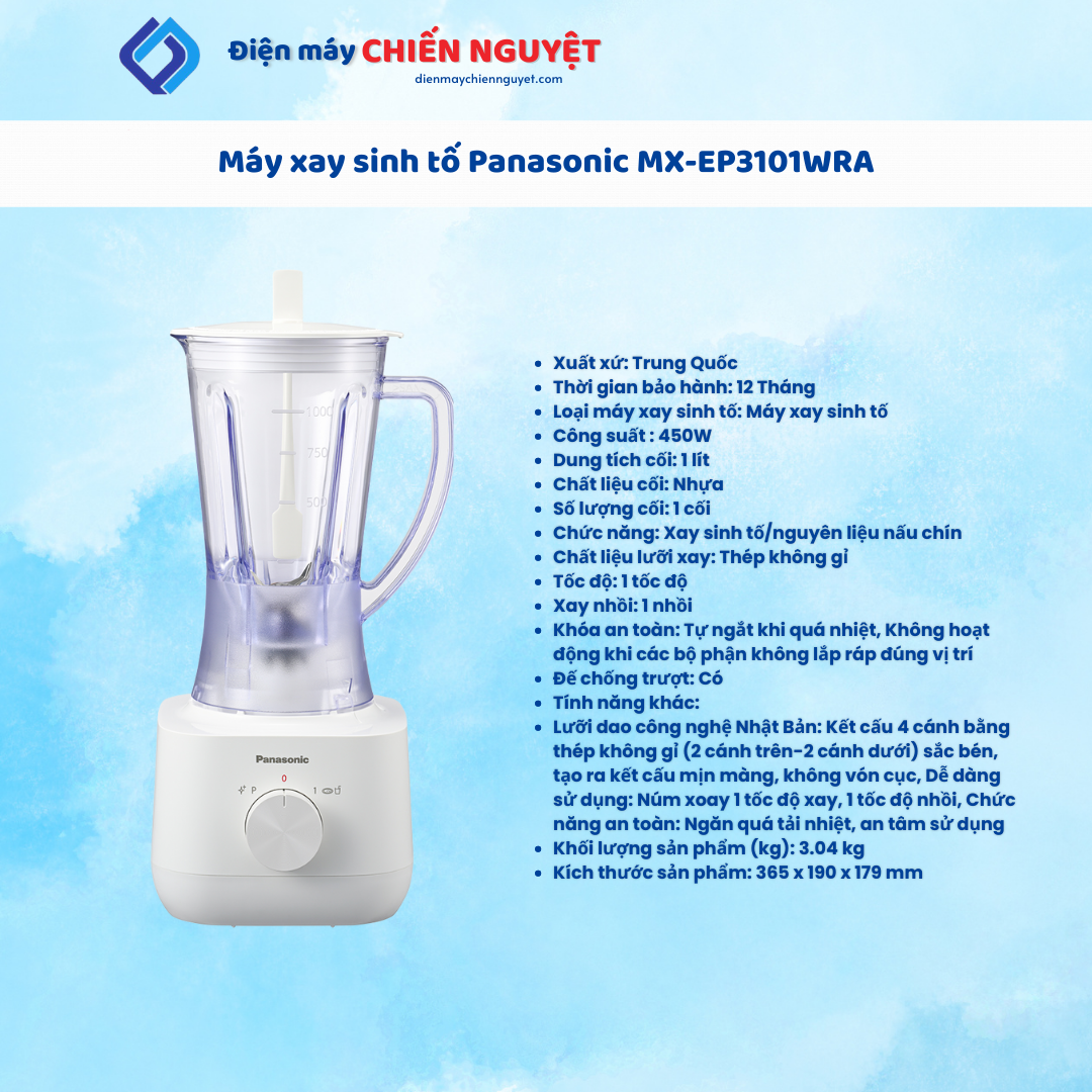 Máy xay sinh tố Panasonic MX-EP3101WRA với công suất hoạt động mạnh mẽ, 1 tốc độ xay và 1 chế độ nhồi giúp xay nhuyễn đều thực phẩm một cách nhanh chóng, nhiều tiện ích đi kèm thuận tiện sử dụng.