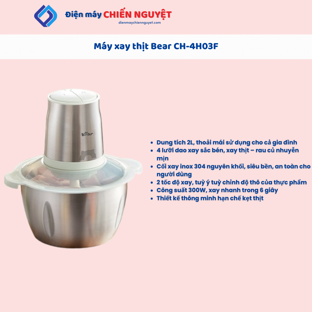 Máy xay thịt Bear CH-4H03F thực sự là lựa chọn lý tưởng cho các bà nội trợ hiện đại. Nếu bạn đam mê sự bền bỉ, công nghệ tiên tiến và tính năng tiện dụng, hãy nhanh chóng trang bị cho mình một chiếc máy này để nâng cao trải nghiệm nấu nướng.