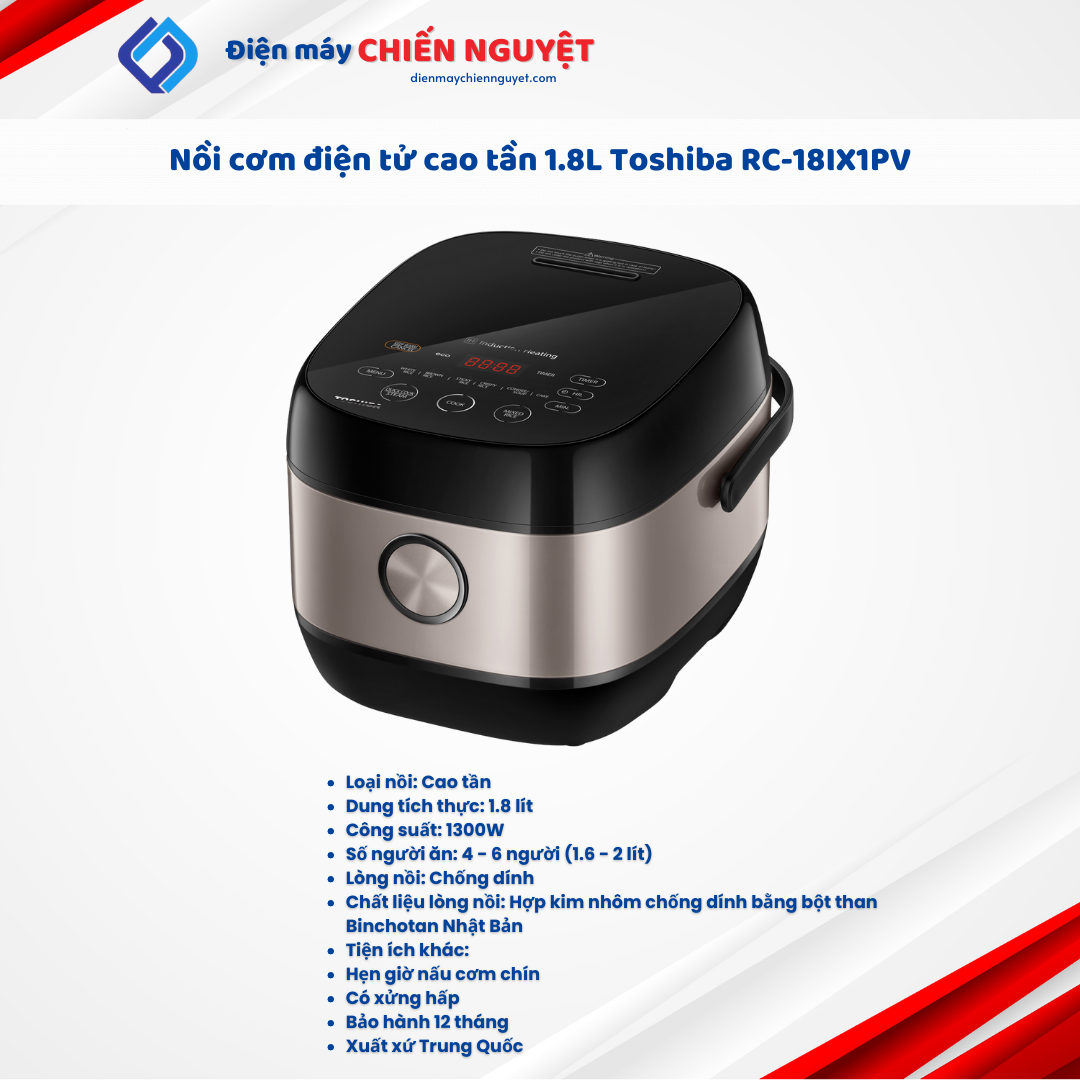 Nồi cơm cao tần Toshiba 1.8 lít RC-18IX1PV với thiết kế đẹp, độ bền cao, nhiều chức năng tiện lợi là một người bạn cần thiết cho bữa cơm của mọi gia đình.