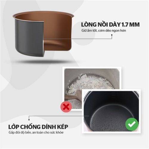– Thiết kế lòng nồi nhôm dày 1.7mm giúp truyền nhiệt tốt, giữ ấm lâu, cơm nấu ra được dẻo hơn, thơm ngon hơn. Đặc biệt, lòng nồi được phủ lớp chống dính kép, tăng gấp đôi độ bền, hạn chế bám dính cơm vào lòng nồi.