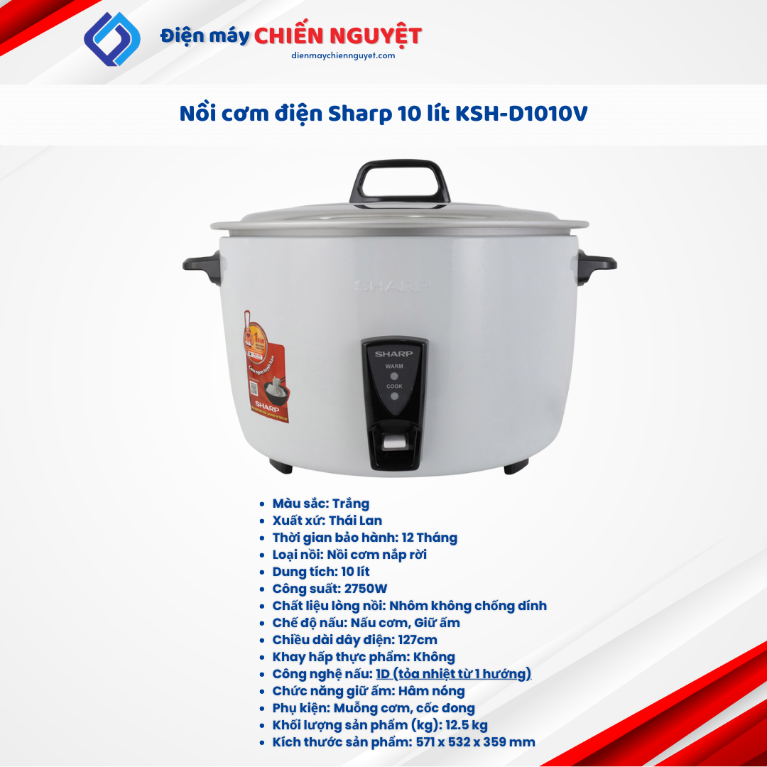 Nồi cơm điện Sharp 10 lít KSH-D1010V là thiết bị gia dụng sở hữu dung tích lớn, giúp nấu nhiều cơm và chín nhanh, thích hợp dùng trong gia đình đông người hay quán cơm, nhà hàng,…