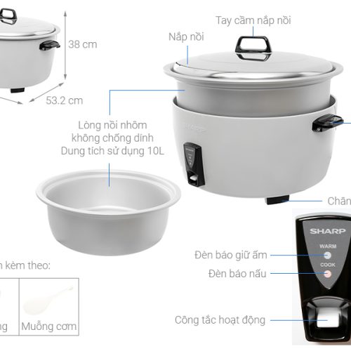 Nồi cơm điện Sharp 10 lít KSH-D1010V sản xuất tại Thái Lan, dung tích cực lớn 10 lít giúp bạn nấu được nhiều cơm, công suất mạnh cho khả năng nấu chín nhanh, nút gạt có đèn báo,… phù hợp gia đình đông người hoặc dùng trong quán ăn, nhà hàng.