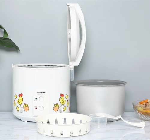 Nồi cơm điện Sharp màu trắng có hoa văn đàn gà bắt mắt, làm nổi bật không gian bếp