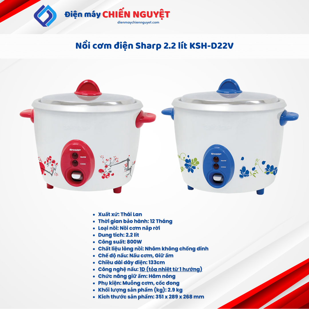 Nồi cơm điện Sharp 2.2 lít KSH-D22V sản xuất năm 2018, sản phẩm tiện ích giá tốt, chất lượng tốt, thương hiệu uy tín đáng tin dùng.
