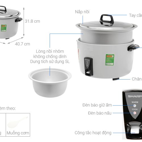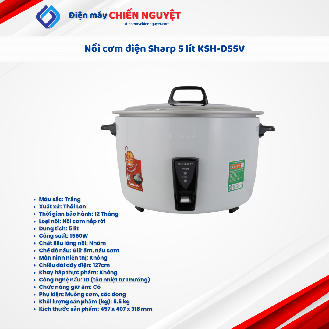 Nồi cơm điện Sharp 5 lít KSH-D55V được sản xuất tại Thái Lan, dung tích lớn 5 lít, công nghệ 1D giúp nấu cơm chín nhanh, thiết kế nút gạt dễ điều chỉnh,… là thiết bị đáp ứng được khẩu phần cơm cho khoảng 8 – 15 người.
